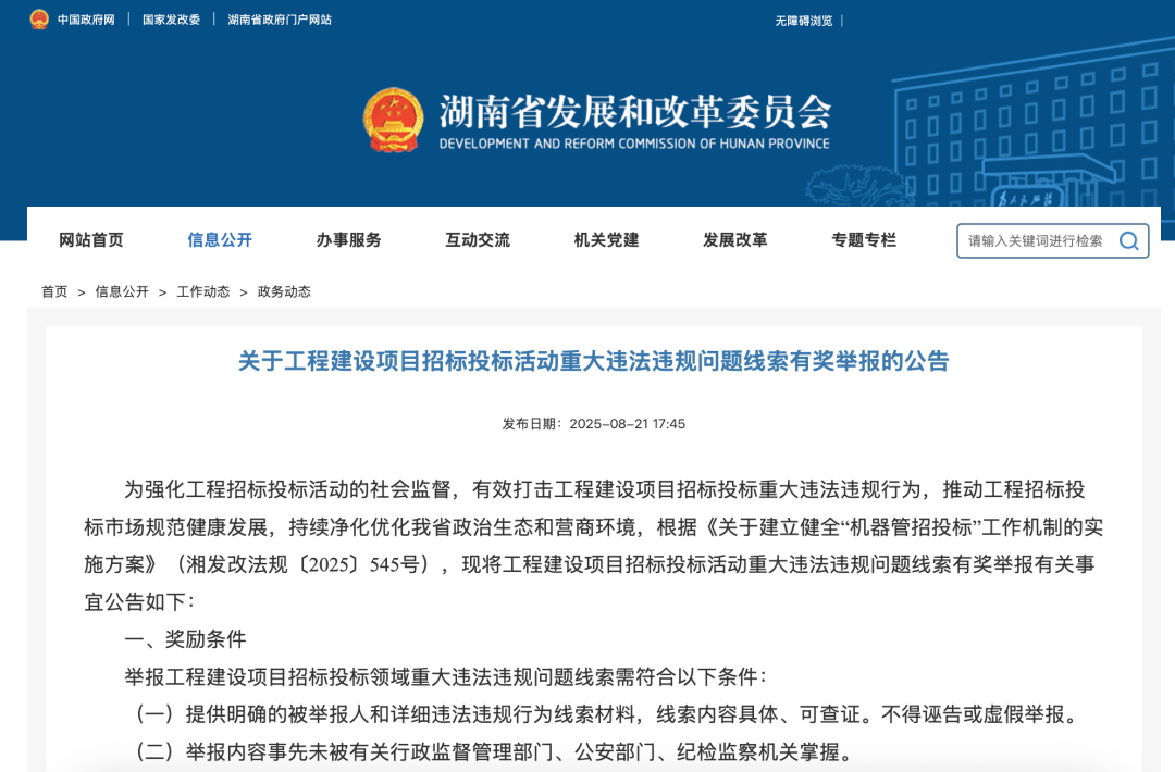 湖南省:对举报围标串标等行为,查实后最高给予10万元奖励