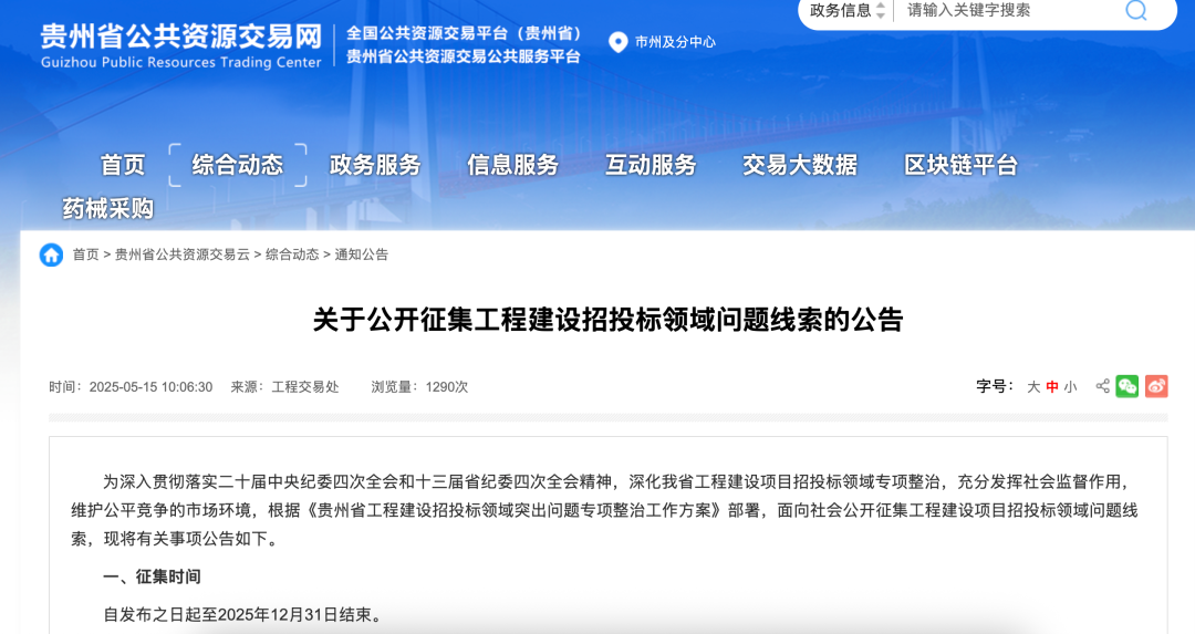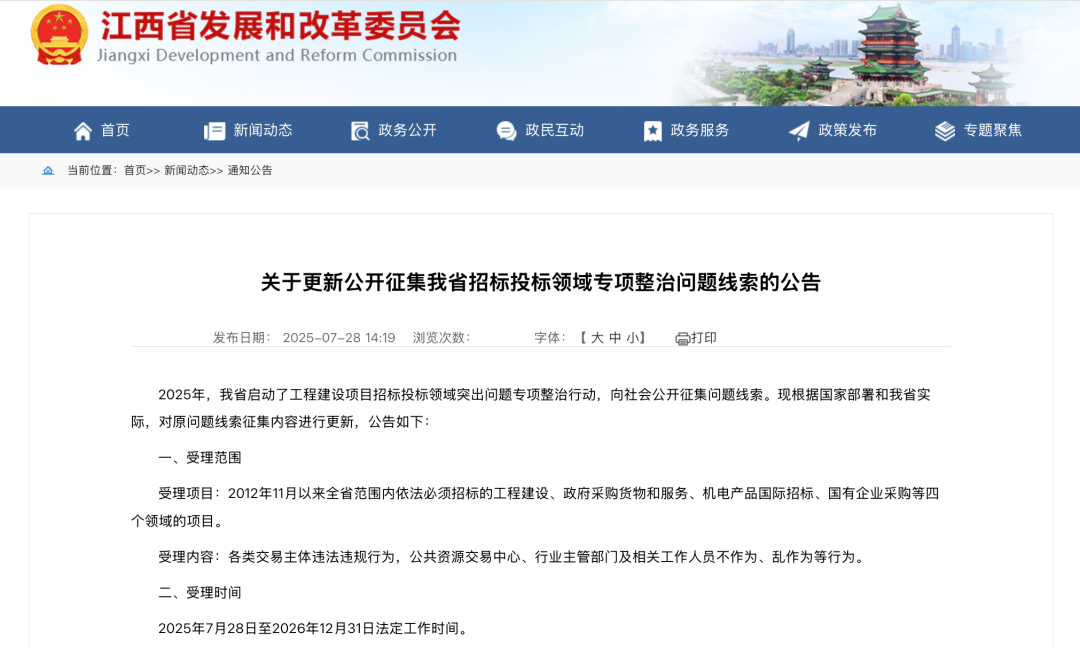 公告明确受理范围为2012年11月以来全省范围内依法必须招标的工程建设、政府采购货物和服务、机电产品国际招标、国有企业采购四大领域的项目线索。该省整治行动的受理时间将持续至2026年12月31日,为公众提供了充足的反映时间。