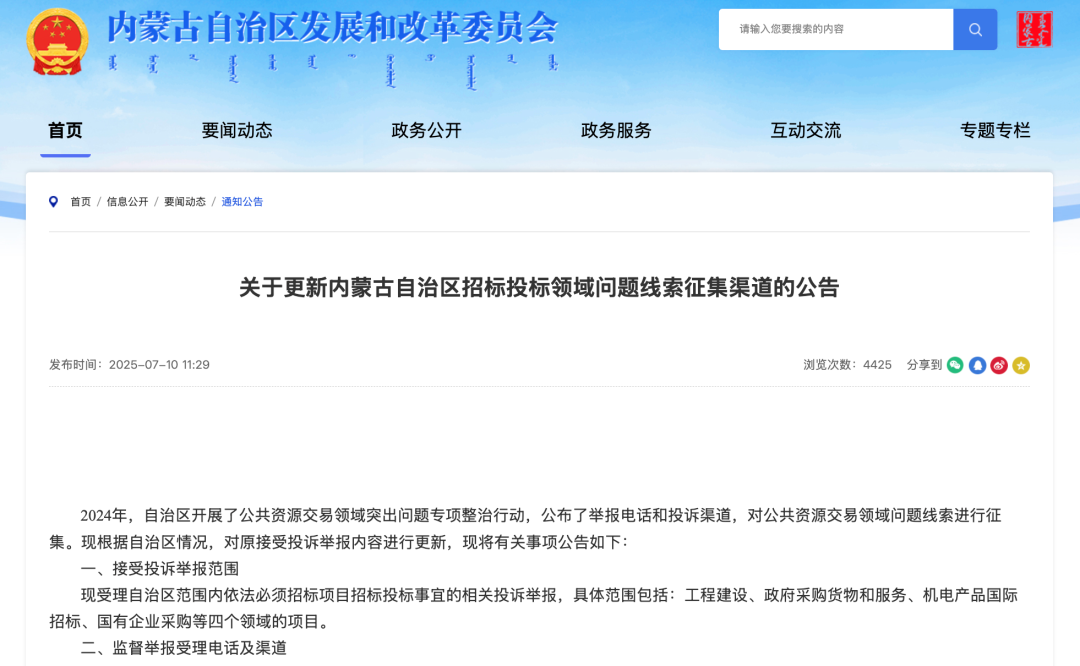 内蒙古自治区将2024年启动的“公共资源交易领域突出问题专项整治行动”进一步深化,明确追溯范围至2012年11月,线索征集受理时间将持续到2026年12月31日。