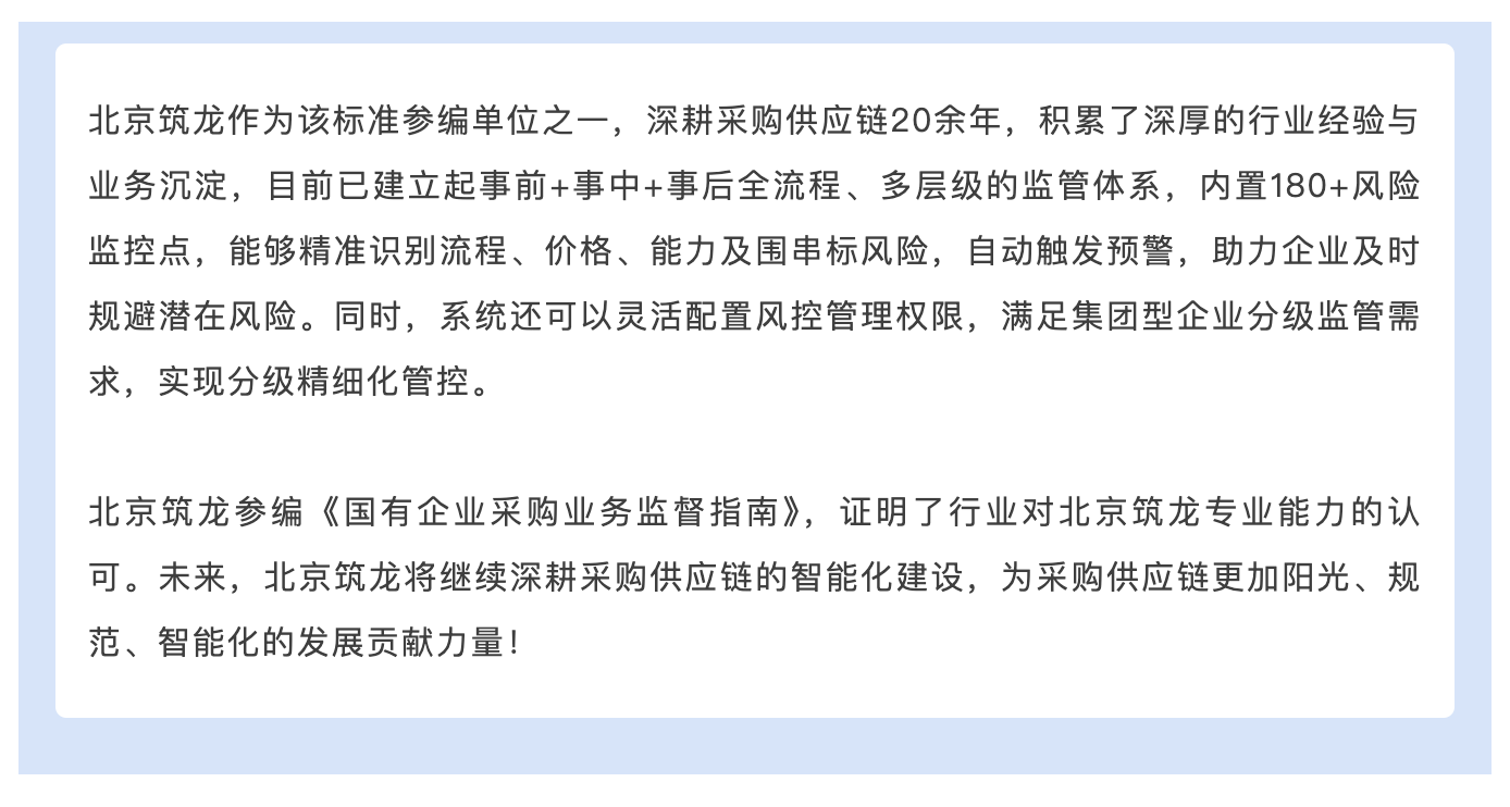近日,中国物流与采购联合会发布《国有企业采购业务监督指南》团体标准,北京筑龙作为深耕采购供应链20余年的产品与服务供应商,深度参与了该项团体标准的编写工作。